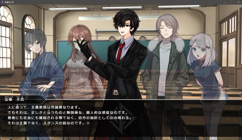 →主観と客観の独立性、そこから派生する正義や恋愛感情などについて、講義・議論形式で扱っています。