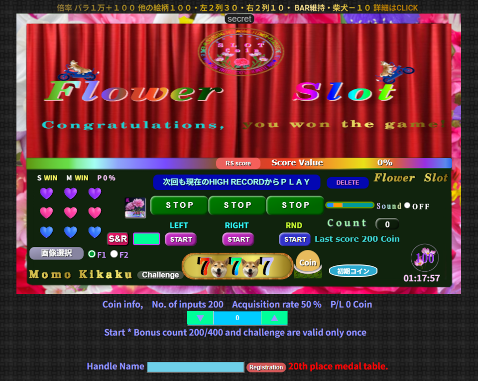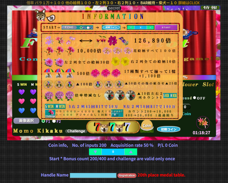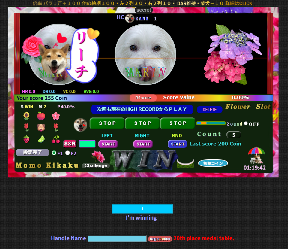 このスロットゲームは、コイン数の増減だけの単純なゲームですが、獲得コイン数の条件倍率(増減)を、多数のパターンを用意しており、少なからずの期待値や、なるべく飽きのこない工夫(エンドレスではないGame End)と花や犬の写真を楽しめるゲームにしました。さらに、リールの回転は下から上に、回転速度は約0.75秒、停止速度は約0.2秒と実際のスロットにほぼ準拠したつもりです。