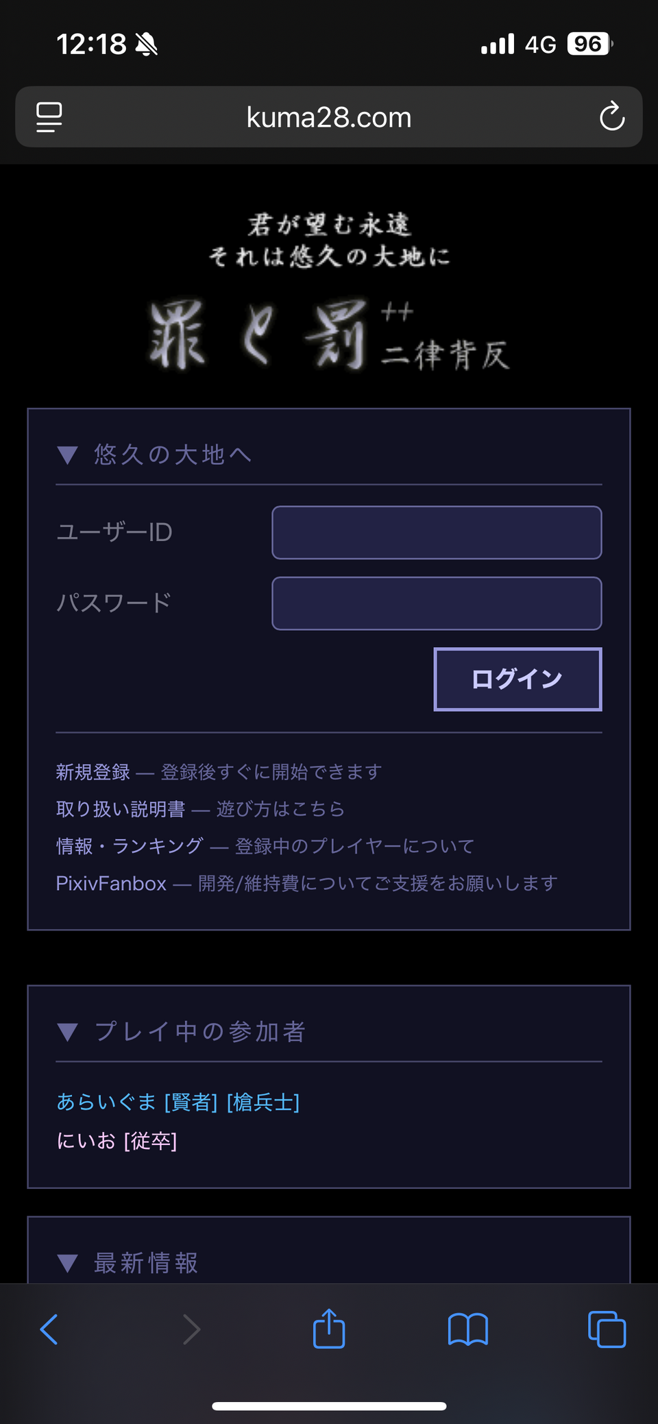 2000年代に流行った無料配布型ブラウザCGIゲームの1つ「罪と罰++二律背反」をモダンwebアプリとして復活させました。リリース日は3/8(日)、現在約20名のプレイヤーが遊んでいます。