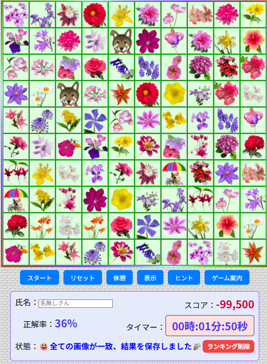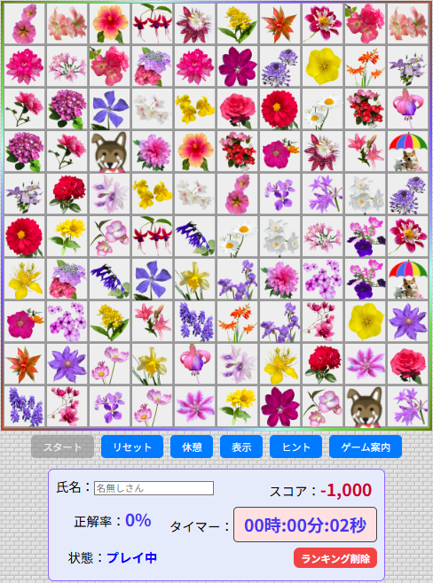 このゲームは一般的な神経衰弱ゲームで、画像をめくり同じ画像を当てて全ての画像を埋める記憶力が必要なゲームです。